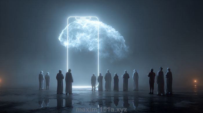 人々が抱く生成AIの抽象的なイメージ:人々が見上げる輝く脳がある