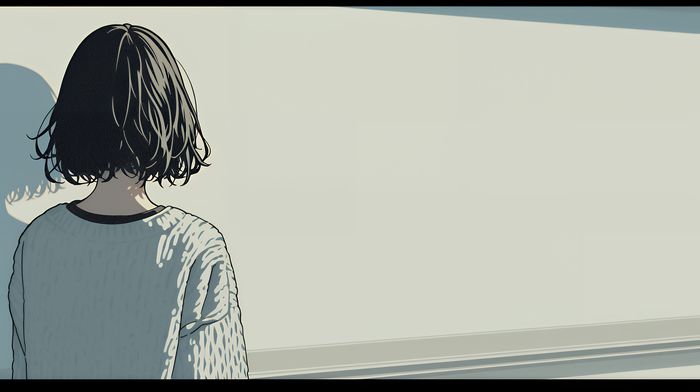 白壁の前で考え事をする女の子のイラストは、